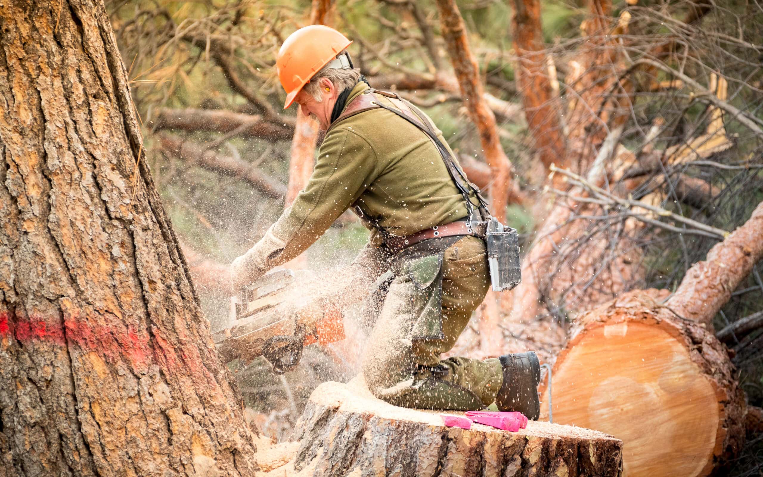 - Select trees are felled by ground crews using low-impact methods.